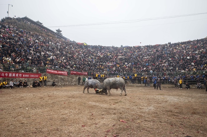 国家旅游地理贵州黔东南2月16日讯(通讯员 吴德军)2023年2月11日,贵州省黔东南苗族侗族自治州从江县丙妹镇五堂松学斗牛塘举办传统斗牛民俗活动,吸引众多游客及周边村民前来观看,现场颇为壮观。